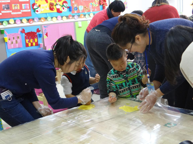 活动前,各班幼儿与老师一起吹气球、挂彩带、剪窗花,精心装扮活动室,营造了浓浓的新年气氛。活动中,家长观看了幼儿一个学期的生活、活动照片,观看了幼儿的皮影故事、个表演等节目;随后,幼儿和家长一起动手包饺子、做糖葫芦、烤饼干等,大家沉浸在一种融洽、和谐、愉快的节日氛围中,度过了一个有意义的节日。